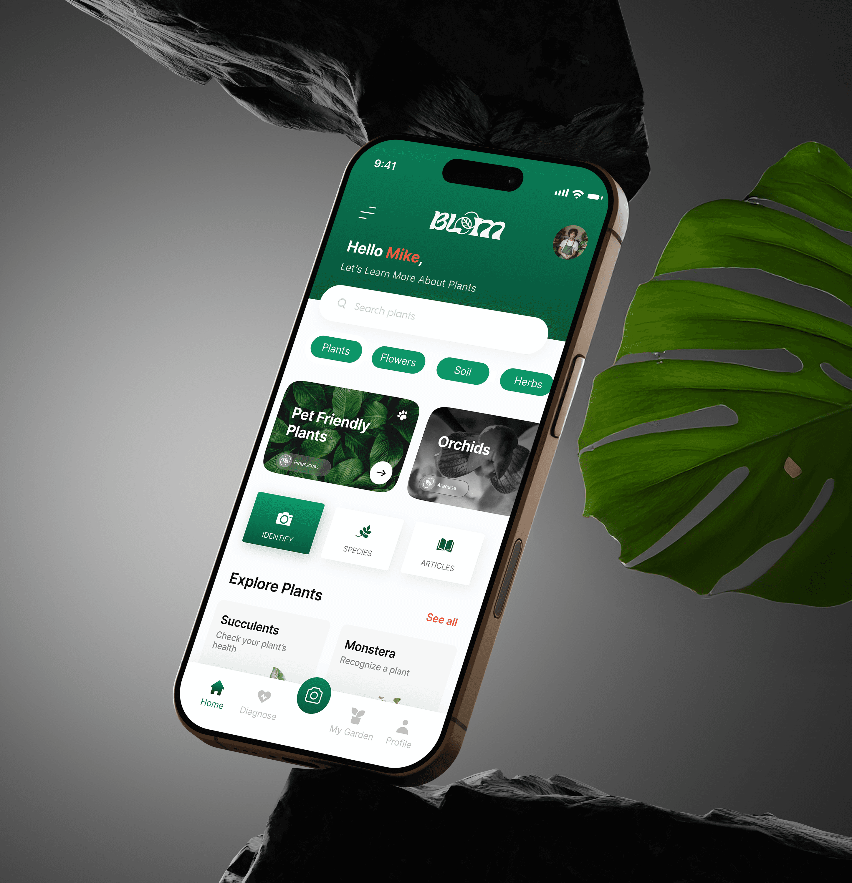 Bloom is a smart plant care app and platform that helps users identify, track, and care for their plants with ease. I designed an intuitive mobile experience paired with a responsive website for plant shopping, expert tips, and community interaction.